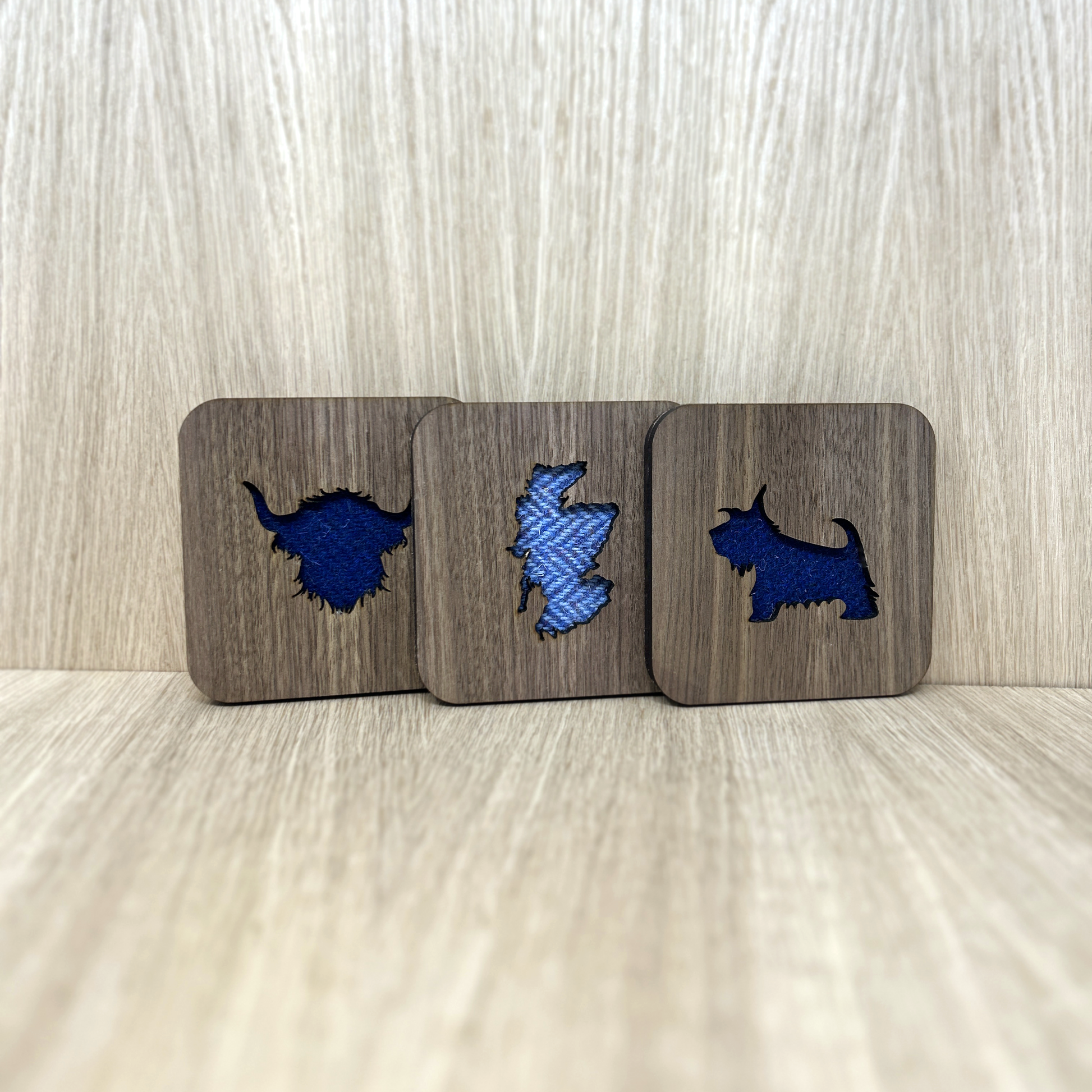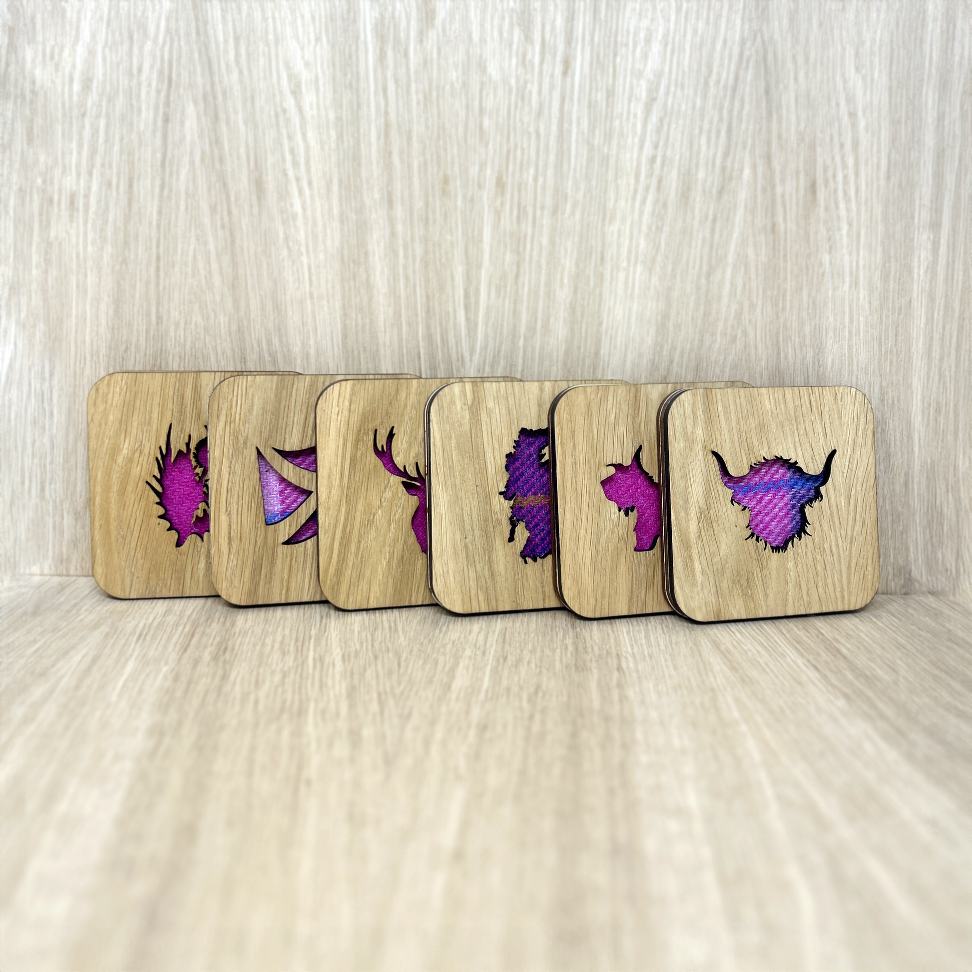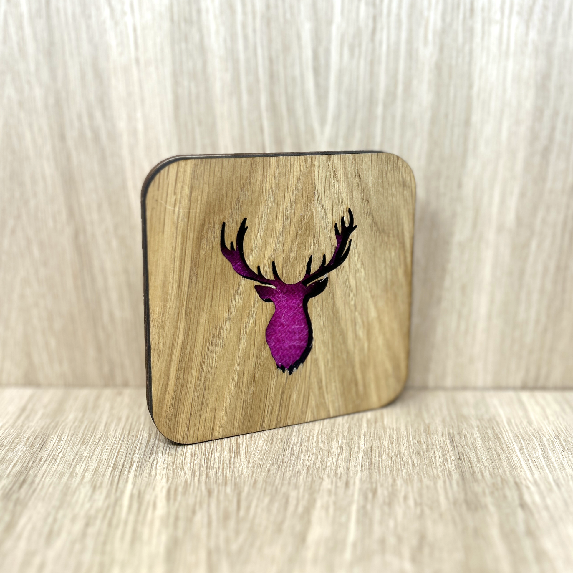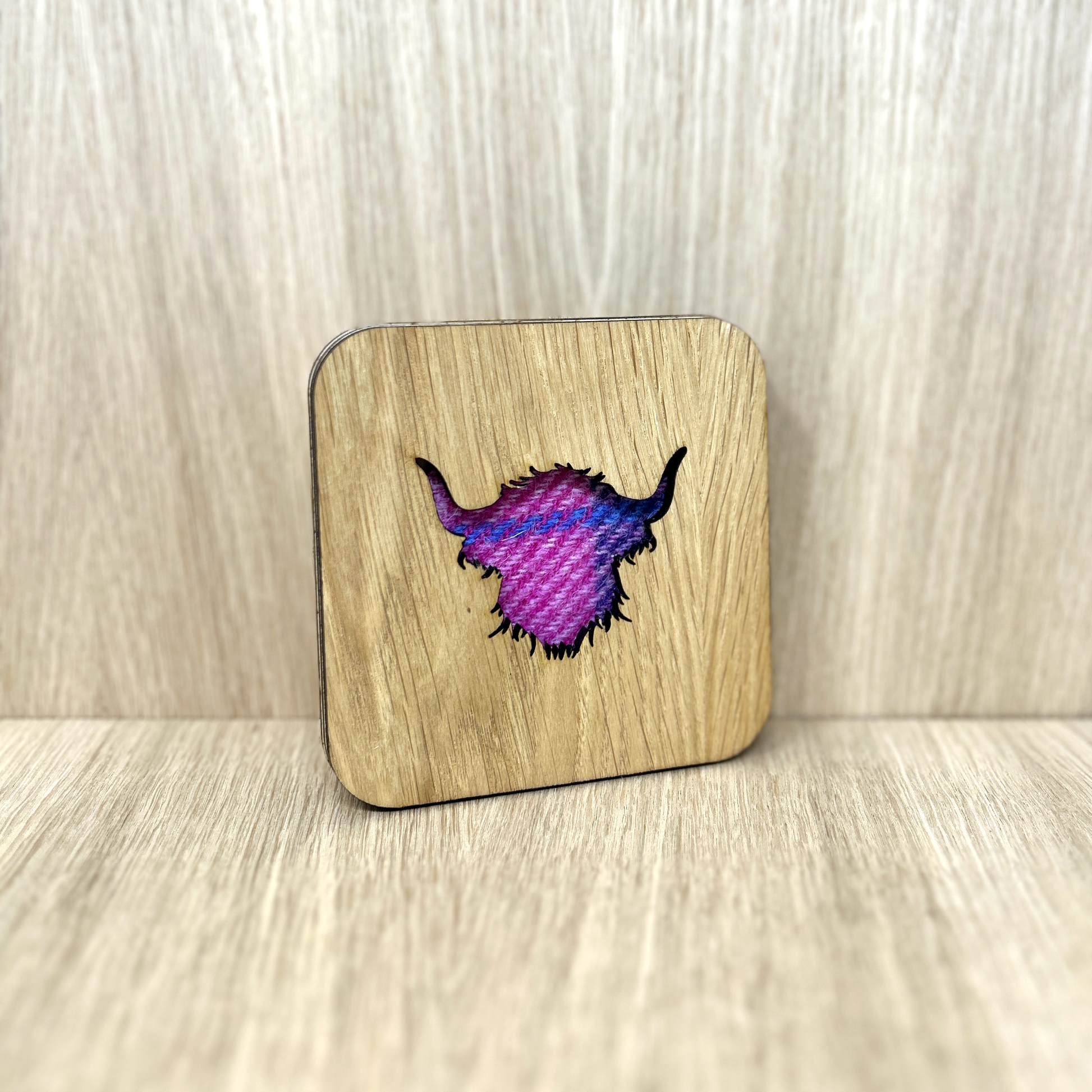 Made with genuine Harris Tweed these square coasters are available in a range of colours* and designs, including Stag, Scottie dog, thistle, and highland cow. Choose from four different wood finishes and three different Harris Tweed colour schemes.