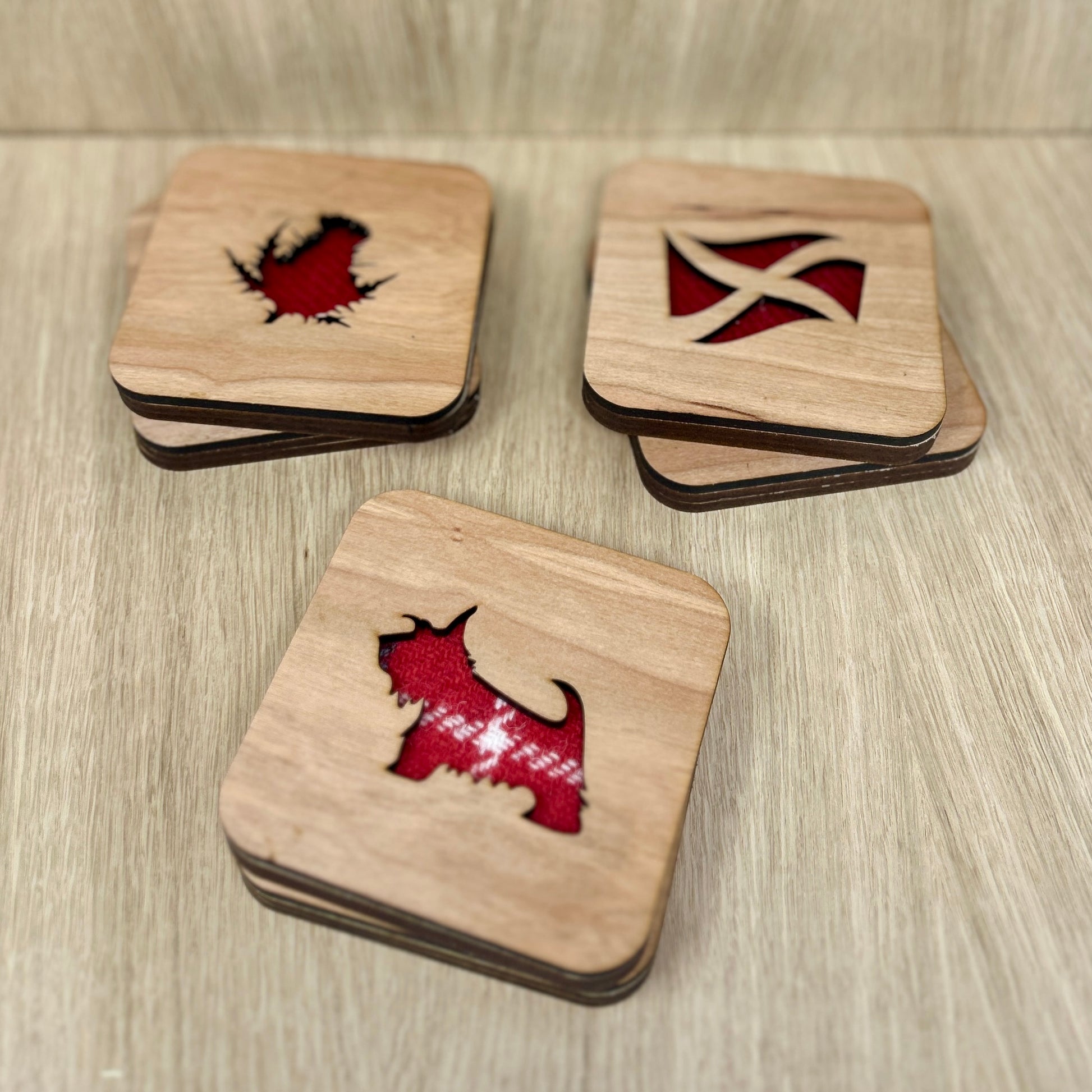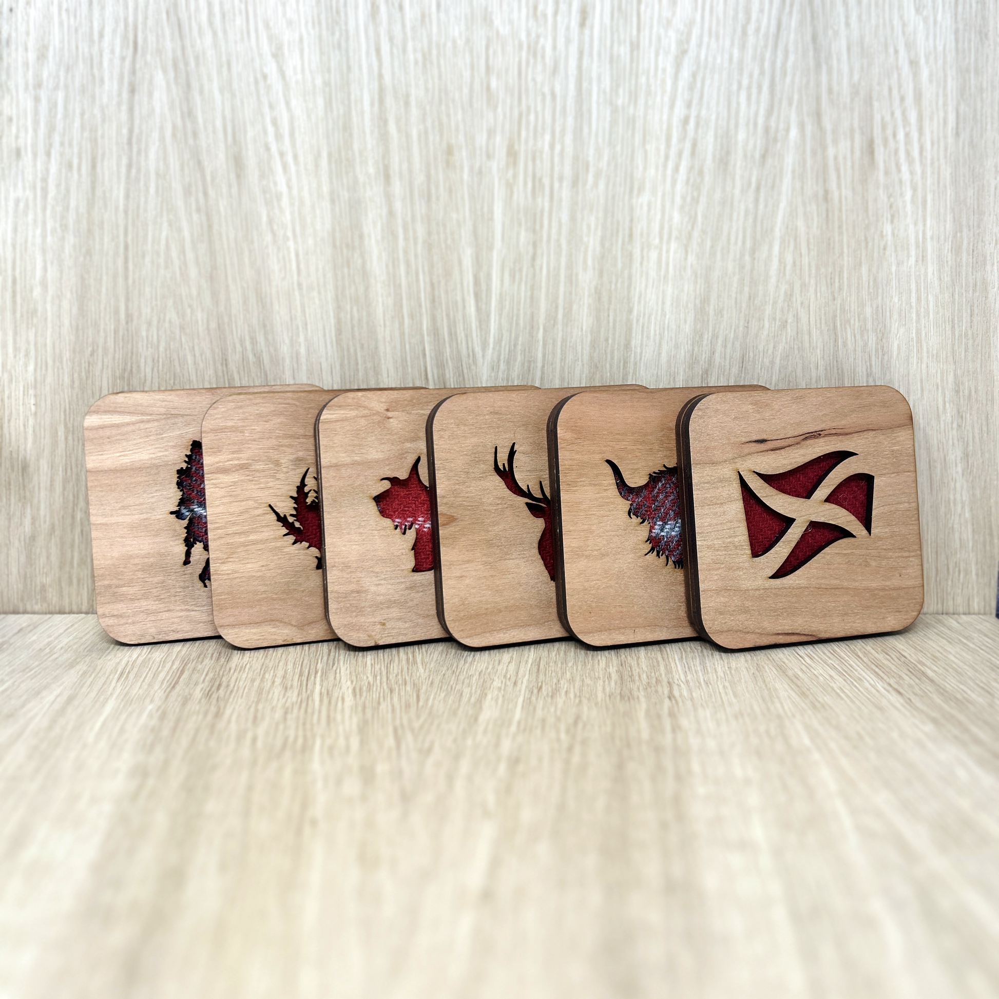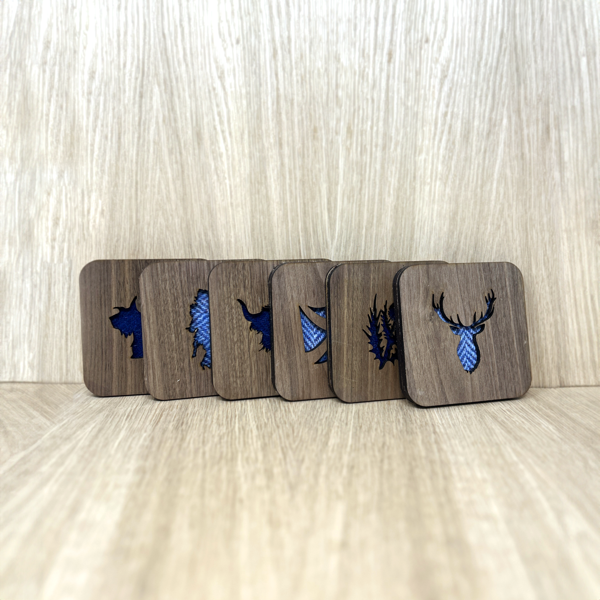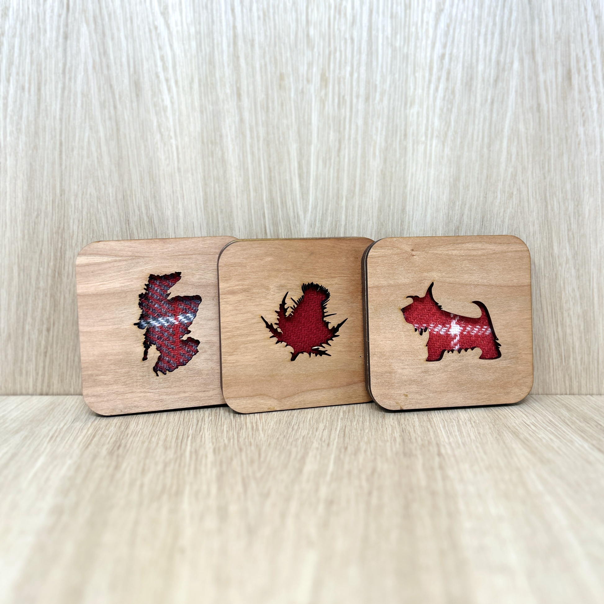 Made with genuine Harris Tweed these square coasters are available in a range of colours* and designs, including Stag, Scottie dog, thistle, and highland cow. Choose from four different wood finishes and three different Harris Tweed colour schemes.